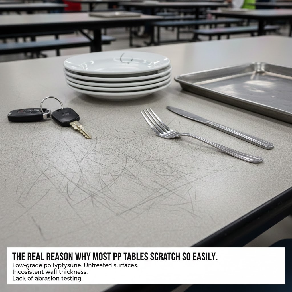 While many PP tables look similar at first glance, the difference becomes obvious after months of use. Tables that resist scratching do not just last longer structurally—they retain their value visually, which matters in customer-facing environments.